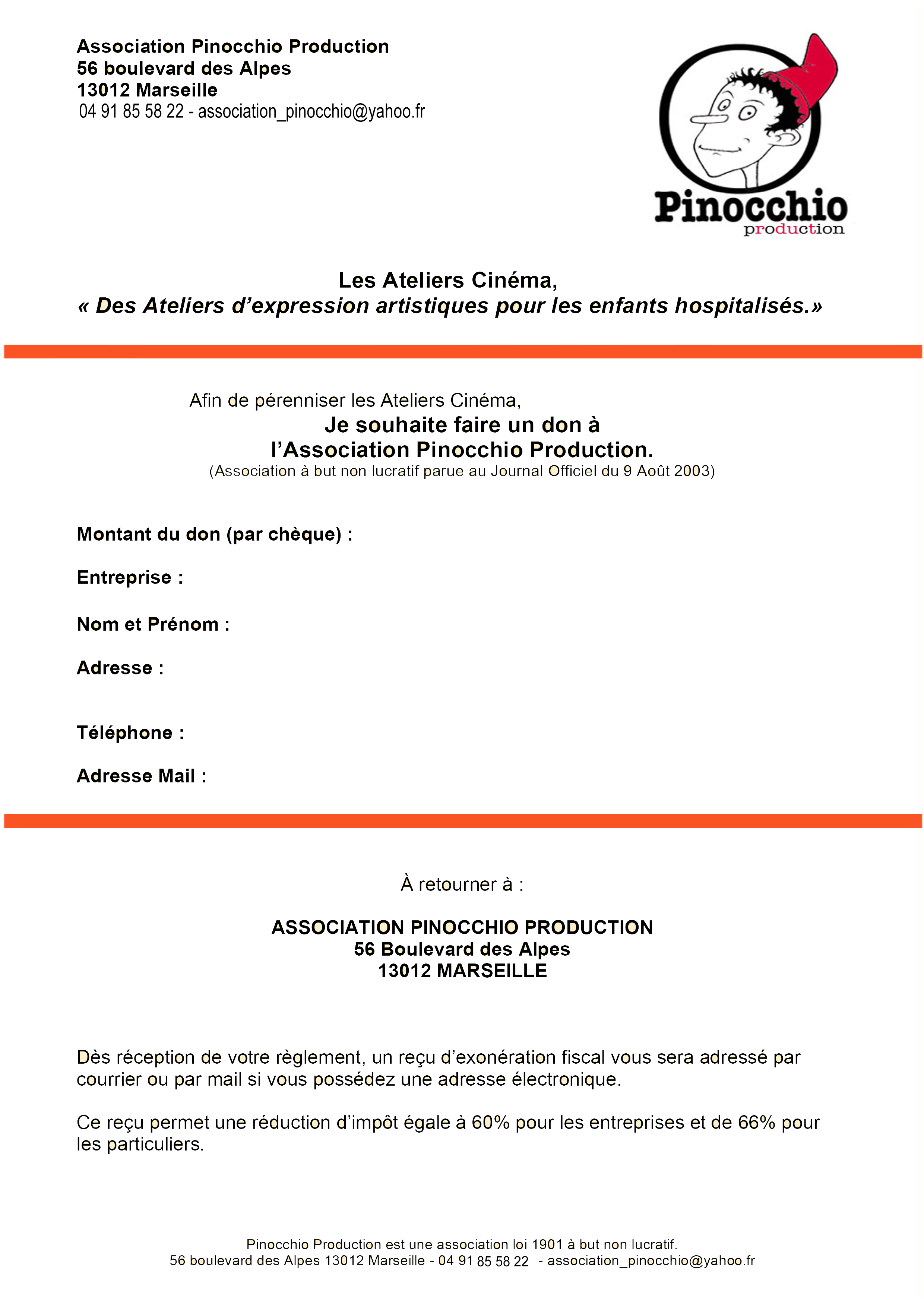 Telechargez le document, remplissez-le et renvoyez-le nous accompagne d'un cheque a l'ordre de l'Association Pinocchio Production.